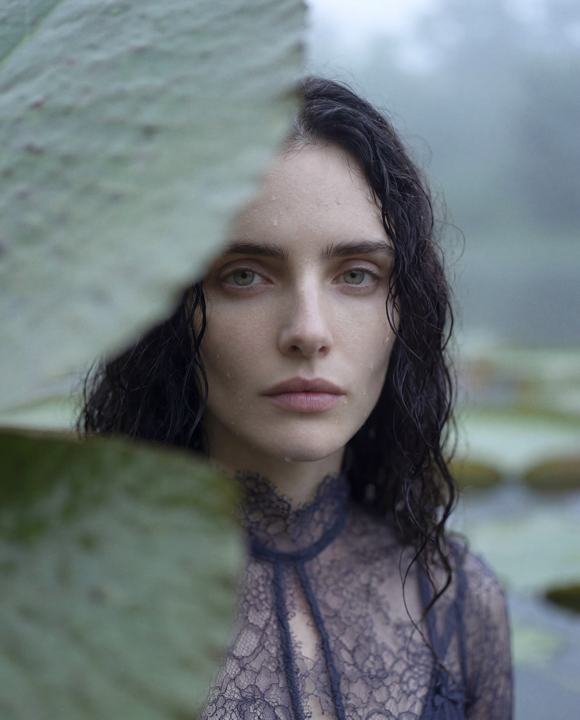 A figure emerges through mist and dark water, suspended between identities — no longer who she was, not yet fully defined. Textures soften, silhouettes blur, and the line between body and landscape disappears.